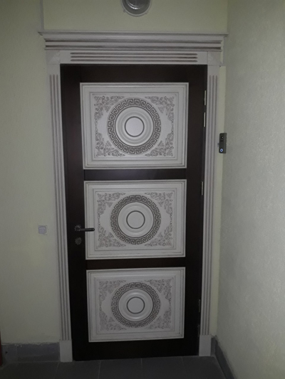 Доборы (порталы) и различные декоративные элементы (карнизы, капители, пилястры и т.п) просчитываются отдельно по факту, в зависимости от размера и сложности данного изделия. Основное покрытие дверей - двухкомпонентные полиуретановые грунты и лаки ведущих итальянских производителей фирмы RENNER и ICA.